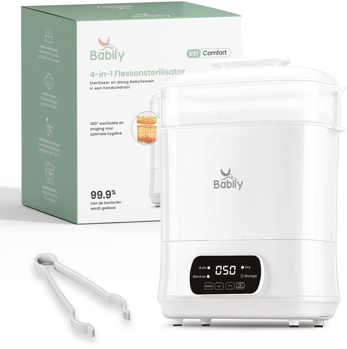 De Babily 4-in-1 flessen sterilisator is een praktische alles-in-één oplossing voor ouders die hygiëne en gemak willen combineren. Dit model kan niet alleen flessen steriliseren, maar ook drogen, opwarmen en steriel bewaren. Daarmee vervangt het meerdere losse apparaten op het aanrecht. Dankzij krachtige stoomtechnologie worden tot 99,9 procent van de bacteriën en ziektekiemen verwijderd, waardoor je baby altijd uit een schone fles drinkt.