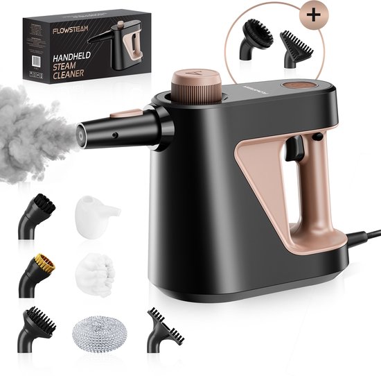 De FLOWSTEAM® 9-in-1 Handstoomreiniger is een compacte handstomer die werkt met stoom rond 110 °C. De stoomdruk wordt opgegeven als 4 bar, wat stevig is voor dit type apparaat. De watertank is kleiner (0,25 liter), maar daar staat tegenover dat je juist een handzaam formaat krijgt dat makkelijk in een kastje past. De opwarmtijd is ongeveer 3 minuten, wat iets langer is dan sommige snelle modellen, maar daarna kun je gericht aan de slag. Het snoer is 3 meter, wat meestal voldoende is voor keuken en badkamer.