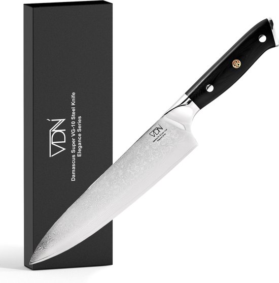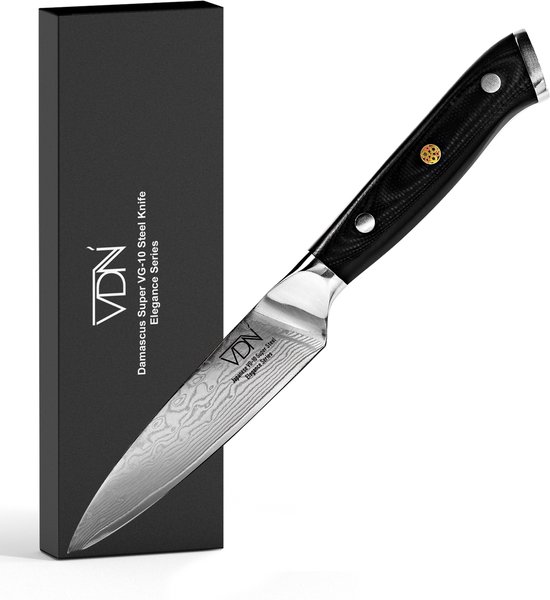 Net als het grotere VDN koksmes heeft dit schilmes een VG-10 kern met 60–62 HRC en daaromheen 66 lagen damaststaal. Dat maakt het mes niet alleen scherp, maar ook stabiel en duurzaam. Het G-10 handvat is ergonomisch gevormd en voelt stevig, ook als je handen een beetje nat zijn tijdens het koken. Dat is precies wat je wilt bij precisiewerk, waar grip het verschil maakt.