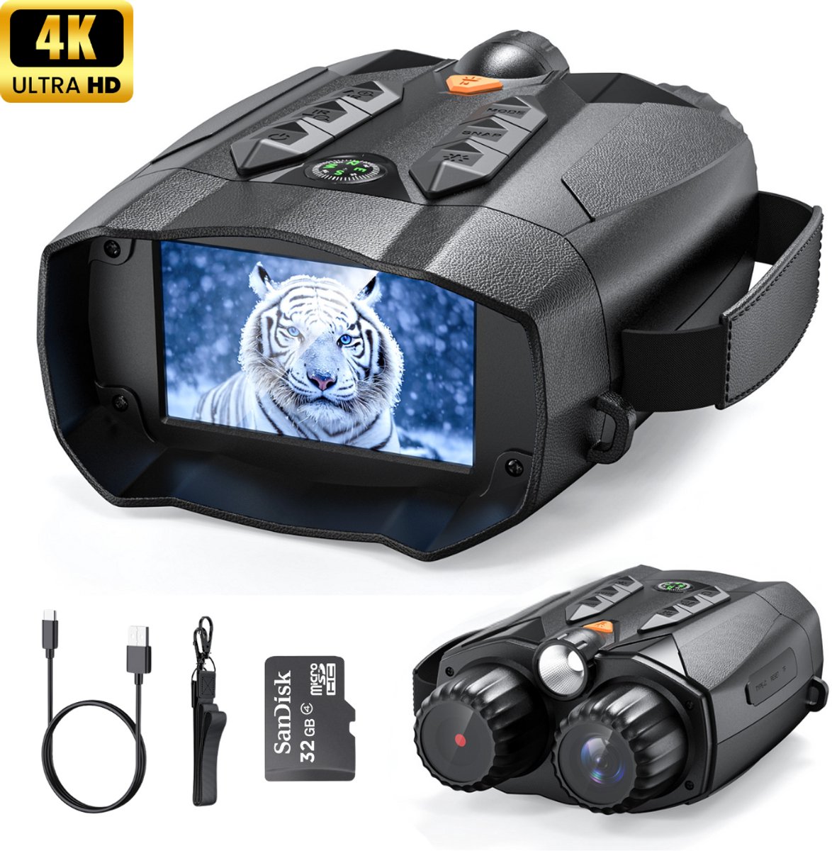 Ook hier ligt de nadruk op vastleggen. Je kunt in 4K video opnemen, en er wordt standaard een microSD-kaart meegeleverd, zodat je direct kunt starten. Dat maakt hem geschikt voor mensen die hun nachtelijke waarnemingen willen bewaren, of bijvoorbeeld een route willen terugkijken. De kijker is compact en komt met draagriem, waardoor je hem makkelijk omhangt en snel pakt als je iets hoort of ziet.