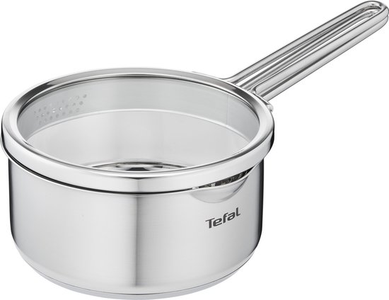 De Tefal Nordica Steelpan is een pan voor wie houdt van een strakke keuken en degelijk RVS zonder poespas. Het ontwerp is duidelijk geïnspireerd op Scandinavische eenvoud: geborsteld staal, heldere lijnen en een platte glazen deksel die weinig ruimte inneemt. Dat ziet er verzorgd uit op het fornuis, maar ook op tafel of op het aanrecht. Met een diameter van 16 centimeter is deze steelpan geschikt voor alledaagse taken als melk opwarmen, saus maken of groenten kort koken. De uitstraling is ingetogen, maar de details verraden dat hier goed over is nagedacht.