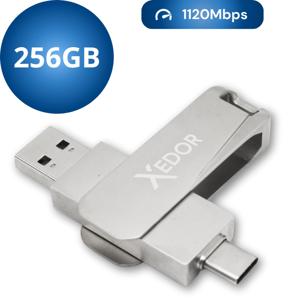 De Xedor Base USB Stick 256 GB is een praktische keuze voor wie veel bestanden wil meenemen en niet afhankelijk wil zijn van adapters. Dankzij de combinatie van USB-A en USB-C sluit je deze stick aan op moderne laptops, desktops, tablets en geschikte smartphones. Dat maakt hem vooral handig voor mensen die regelmatig werken op meerdere apparaten. De opslagcapaciteit van 256 GB is ruim genoeg voor grote verzamelingen foto’s, video’s, documenten en back-ups. Door het metalen ontwerp met draaisysteem voelt de stick stevig aan en blijft de aansluiting beter beschermd wanneer je hem niet gebruikt.