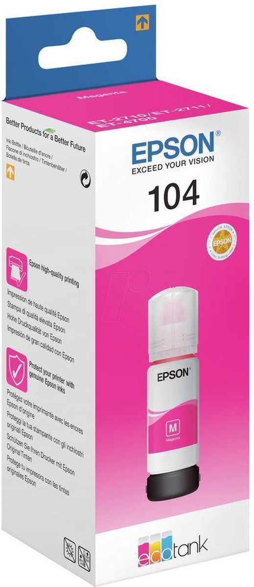 Maak het afdrukken gemakkelijker met de 104 inktserie in vier kleuren. Het geeft je een eenvoudige en voordelige oplossing voor dagelijkse afdrukbehoeften. Met een enkele inktset kun je duizenden pagina's afdrukken zonder een inktpatroon te hoeven vervangen. En bijvullen is een fluitje van een cent dankzij de nieuwe flessen. Alledaags afdrukken Of je nu huiswerk voor school of vliegtickets moet afdrukken, dit gamma vierkleuren pigment- en dye inkten biedt een betrouwbare en eenvoudige oplossing. Lagere inktkosten Zoek je een extra voordelige afdrukoplossing? Vanaf de eerste set inkt die bij je printer geleverd wordt, kun je gemiddeld tot 90% op inktkosten besparen. De inkt is niet alleen kostenbesparend, hij levert ook een indrukwekkend aantal pagina's: tot 4.500 in zwart-wit en 7.500 in kleur. Speciaal ontworpen voor gebruiksgemak Epson's inktflessen zijn nu nog gemakkelijker in het gebruik dankzij een nieuw ontwerp. Met de nieuwe flessen is bijvullen een fluitje van een cent - vul gewoon de juiste kleur in het juiste inktreservoir.