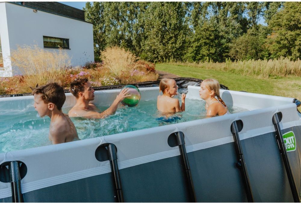Het EXIT Stone zwembad 400 x 200 x 122 cm is een rechthoekig grijs frame zwembad. Dit zwembad is standaard uitgerust met een filterpomp en een zwembadtrap waarmee je veilig in en uit het zwembad kunt komen. Het stenen zwembad heeft een modern en sterk steenpatroon op de zijwand en is daardoor een echte blikvanger in de tuin. Het EXIT zwembad heeft sterke 3-laagse wanden van PVC en polyester en de binnenkant van het zwembad is blauw, voor dat frisse zwembadgevoel. De meegeleverde filterpomp houdt het water schoon en in beweging, zodat vervuiling van het water wordt tegengegaan. Het stalen zwarte frame van het zwembad is extra dik met een diameter van 50 mm en de framepoten zorgen voor optimale stabiliteit, zodat het zwembad altijd stevig staat. Natuurlijk is ook aan duurzaamheid gedacht: het zwarte frame is gegalvaniseerd en gepoedercoat, zodat roest geen kans krijgt. Bij EXIT Toys noemen we dit het Duplex Coating Systeem.