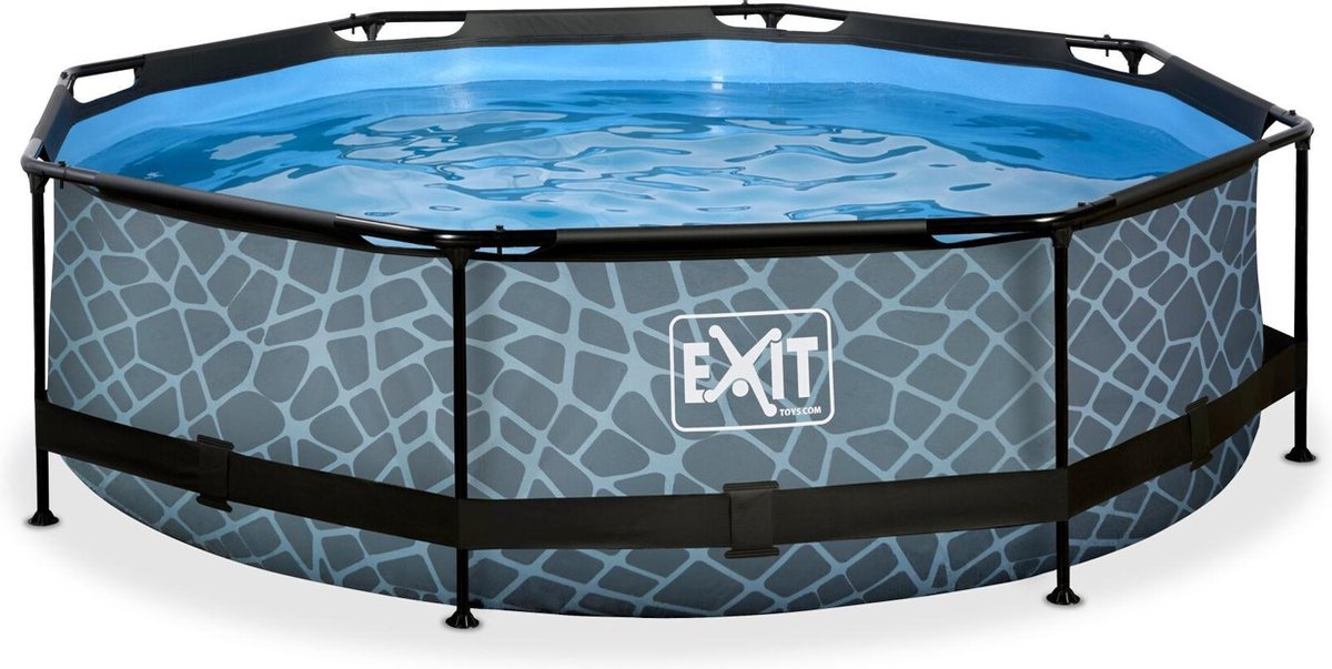 Het EXIT Stone zwembad is een rond grijs frame zwembad. Het zwembad is standaard uitgerust met een filterpomp en valt op tussen andere zwembaden door zijn geweldige steenpatroon. Het gepoedercoate stalen frame en de sterke poten van het EXIT Stone zwembad zorgen ervoor dat het zwembad altijd stabiel staat en jarenlang gebruikt kan worden. De meegeleverde filterpomp houdt het water schoon en in beweging, zodat vervuiling van het water wordt tegengegaan. De filterpomp kan gemakkelijk aan het zwembad worden bevestigd en met behulp van filterpatronen wordt het water ververst. Het geweldige steenpatroon en het zwarte frame geven de Stone Pool een unieke uitstraling en dankzij het natuurlijke uiterlijk integreert het zwembad volledig in je tuin. De binnenkant van het zwembad is blauw, zodat je dat frisse zwembadgevoel hebt. Voor het EXIT Stone zwembad zijn diverse accessoires verkrijgbaar, zoals een bodem- en afdekzeil, een chloordrijver, teststrips en een zwembadreinigingsset om je zwembad in optimale conditie te houden. De zwembadafdekking maakt het zwembad compleet.