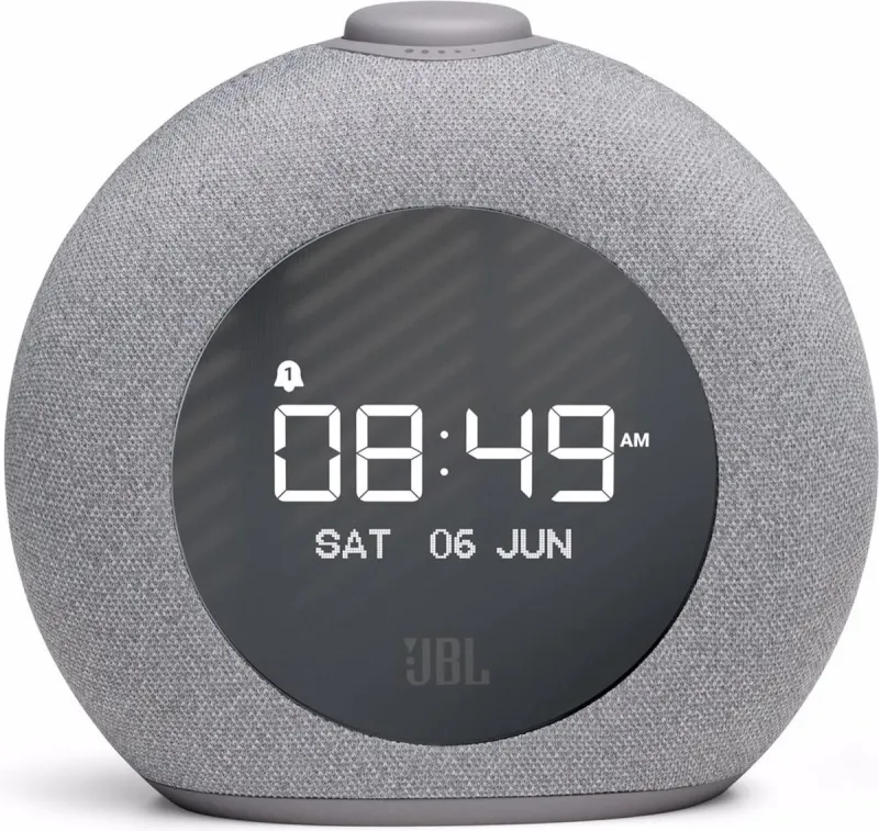 JBL Horizon 2 DABBluetooth radio wekker met DAB/DAB / FM Begin je dag met JBL Pro Sound. Laat JBL Pro Sound je wakker maken. Met zijn kenmerkende ronde vormgeving, LED sfeerverlichting en DAB/DAB/ FM radio maakt de JBL Horizon 2 je slaapkamerervaring compleet. Een groot LCD scherm toont duidelijk de tijd, alarminstellingen en radio-informatie, terwijl de stijlvolle stoffen bekleding perfect in elk interieur past. Je kunt kiezen uit een reeks alarmtonen of je favoriete zenders via DAB, DAB of FM. Met de gemakkelijk te bedienen bedieningsknop kun je de wektijd instellen, de sluimerfunctie, het volume en het omgevingslicht, of de wekker aan- en uitzetten. Met twee handige USB poorten om toestellen op te laden is de JBL Horizon 2 gewoon perfect voor op je nachtkastje.