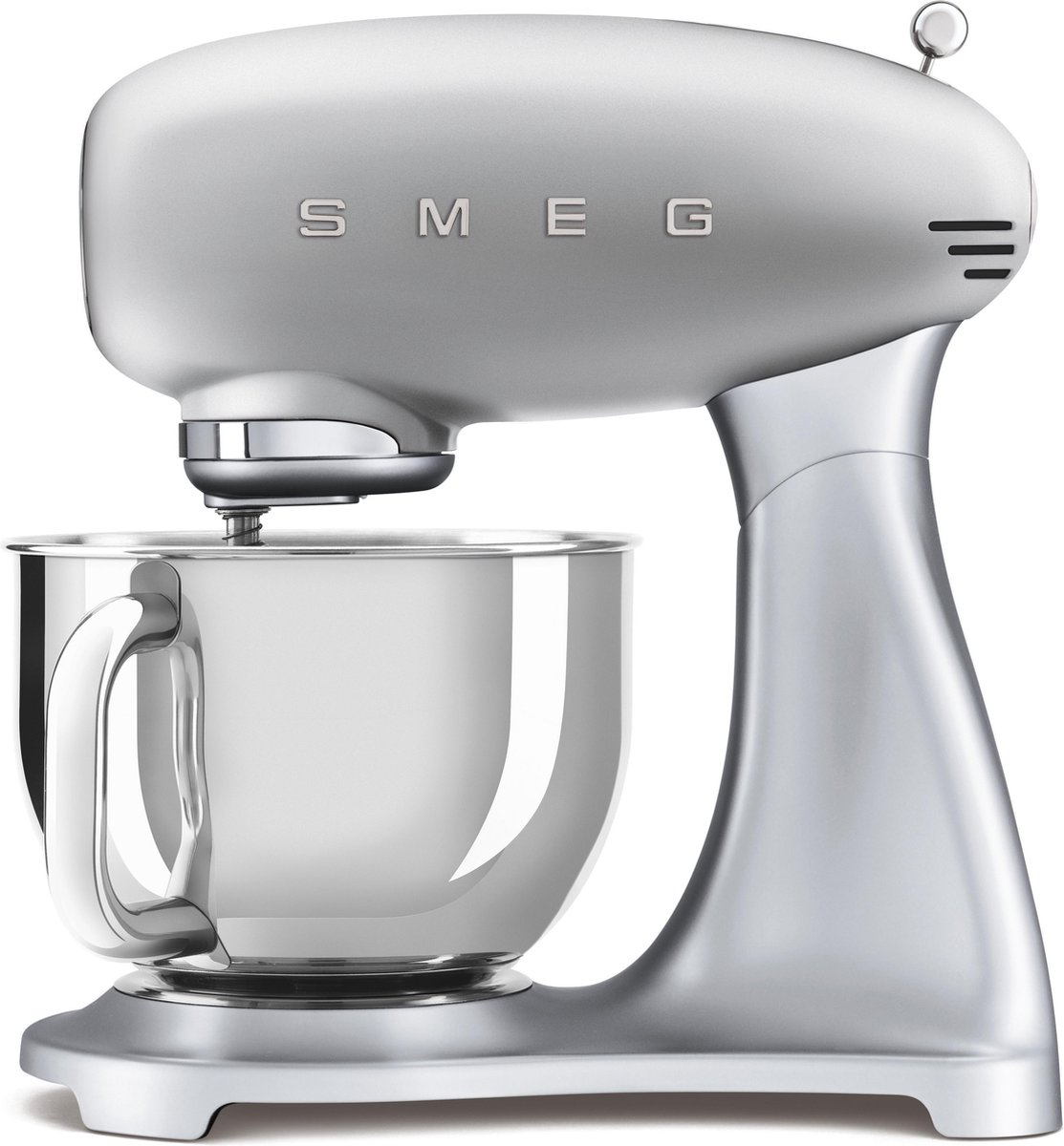 De SMF02 keukenmachine van de fabrikant SMEG verschijnt in een klassiek en stijlvol ontwerp. SMEG is een Italiaanse fabrikant van huishoudelijke apparaten met hoofdkantoor in Guastalla in de Noord-Italiaanse provincie Reggio Emilia. Het bedrijf is wereldwijd vertegenwoordigd met meer dan 18 filialen en levert al meer dan 60 jaar moderne en elegante huishoudelijke apparaten in samenwerking met beroemde architecten. De SMF02 keukenmachine met zijn 800 watt motor kan op tien verschillende snelheden worden ingesteld, waardoor hij de perfecte metgezel is voor elke keukentaak. Dankzij de elegante metalen behuizing en de antislipvoetjes worden trillingen tot een minimum beperkt. Bovendien biedt de robuuste roestvrijstalen kom met een inhoud van 4,8 liter ook voor grotere hoeveelheden deeg voldoende ruimte. Tot de standaard accessoires behoren ook een roestvrijstalen garde, een aluminium platte klopper, een aluminium deeghaak en een uiterst praktische spatbescherming van gemakkelijk te reinigen kunststof. Met de Italiaanse alleskunner slaag je gegarandeerd in een mum van tijd voor elk gerecht. Niet voor niets werd de SMF02 keukenmachine in een vergelijkende test tot testwinnaar gekozen en wint hij regelmatig de Red Dot Design Award. Met een model van dit merk krijg je een duurzame en stijlvolle partner voor al je bak- en kookcreaties.