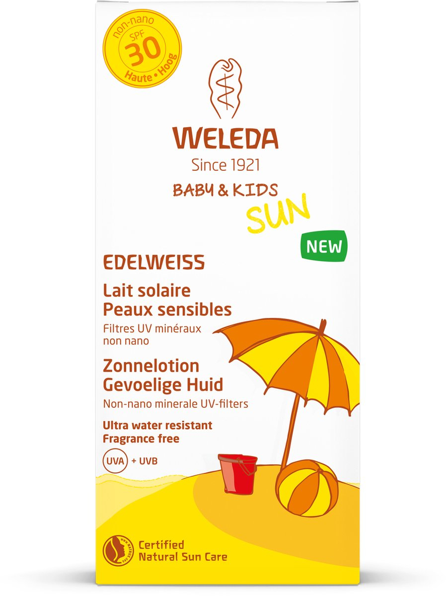 Als je graag tijd in de zon doorbrengt met je kinderen, is hoogwaardige zonverzorging het allerbelangrijkste. De Edelweiss Sensitive Sun Milk SPF 30 van Weleda is de ideale zonbescherming voor baby's, kinderen en natuurlijk voor volwassenen met een bijzonder gevoelige huid.Geniet van de zon zonder spijtDe Edelweiss Sensitive Sun Milk SPF 30 van Weleda is een zonverzorgingsproduct dat geen chemische UV-filters bevat. Dit maakt het perfect voor baby's en peuters, maar het kan ook gebruikt worden door volwassenen met een zeer gevoelige huid. Het minerale UV-filter met een hoge beschermingsfactor 30 biedt onmiddellijke bescherming van je huid tegen de schadelijke zonnestralen. Bovendien voorziet de Edelweiss Sensitiv zonnemelk SPF 30 met waardevolle extracten van biologische edelweiss en hoogwaardige biologische plantaardige oliën de huid van veel vocht. Deze zonverzorging van Weleda is waterproof en geurloos. Om ervoor te zorgen dat de zonbescherming optimaal blijft, moet de huid regelmatig opnieuw worden ingesmeerd. Dit geldt vooral nadat je in het water bent geweest of als je veel zweet.
